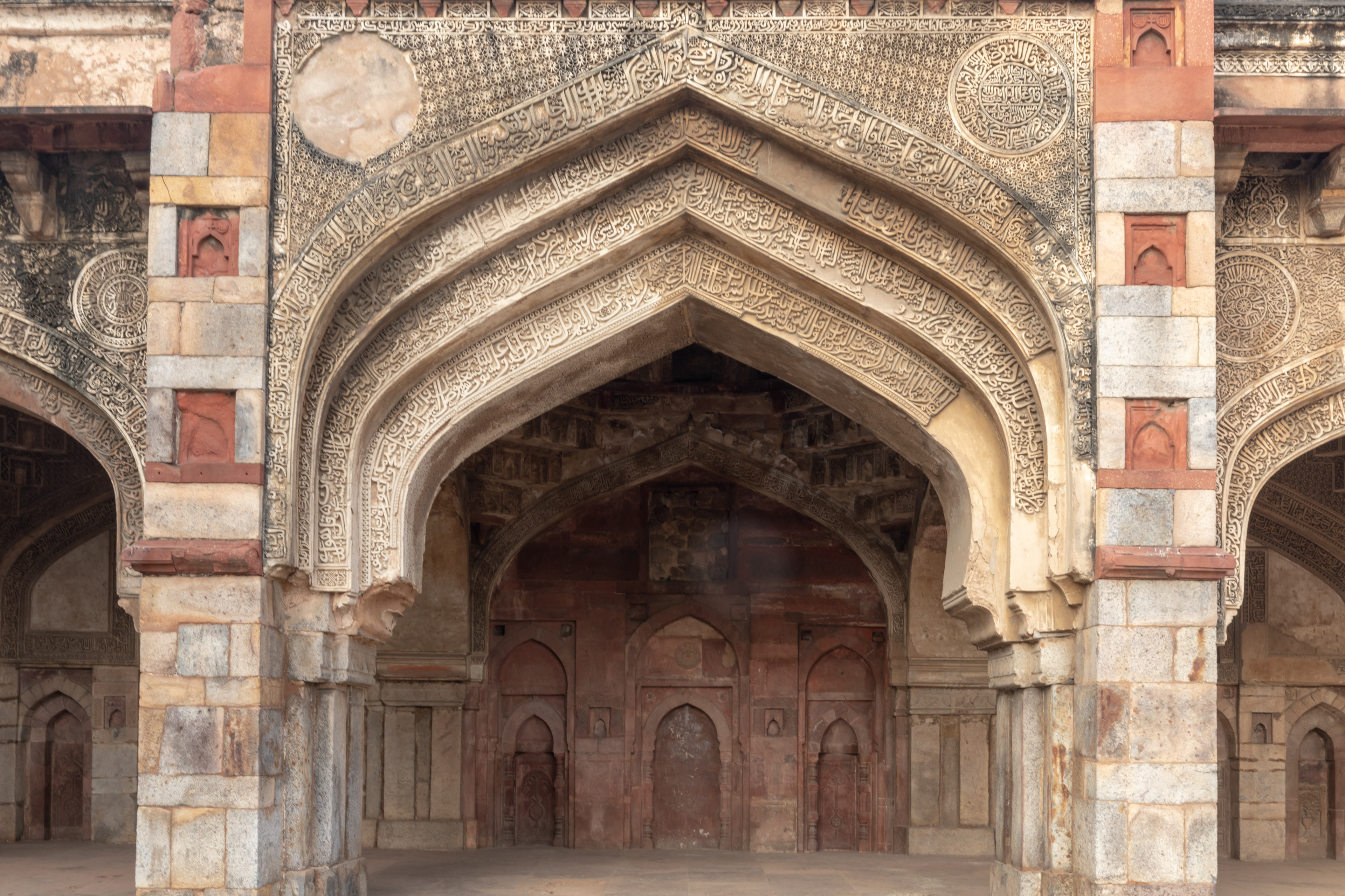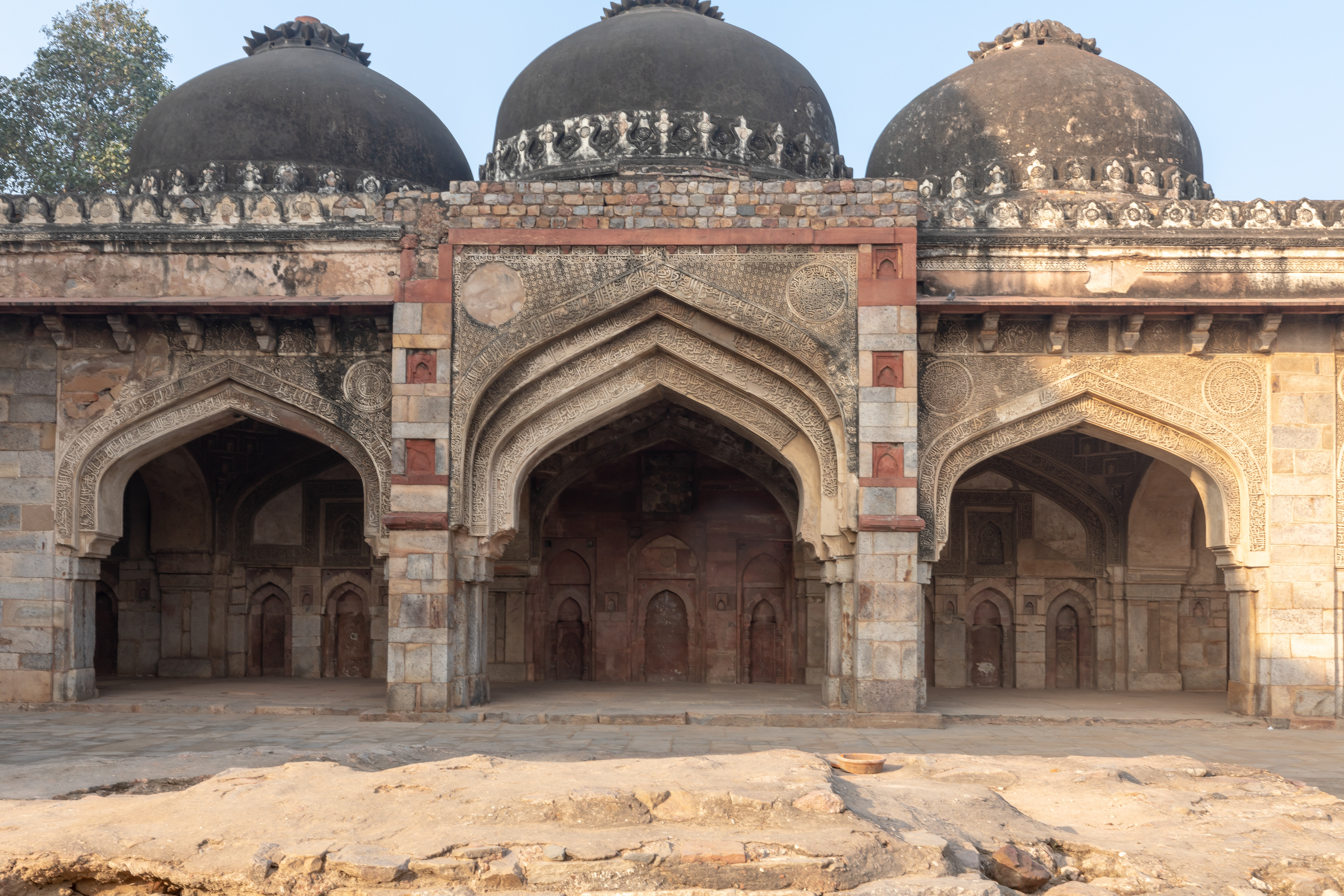 A small mosque stands on the northwest corner of Bada Gumbad. The interiors are richly decorated with stucco and frescoes, featuring floral and geometric designs, as well as Quranic inscriptions. Tapering minarets on the back corners and oriel windows are some of the unique features of the Bada Gumbad mosque.